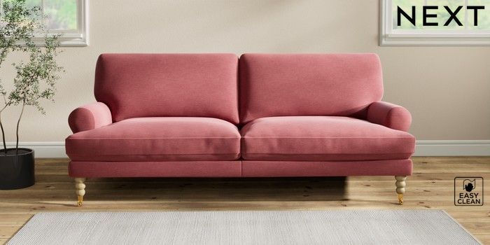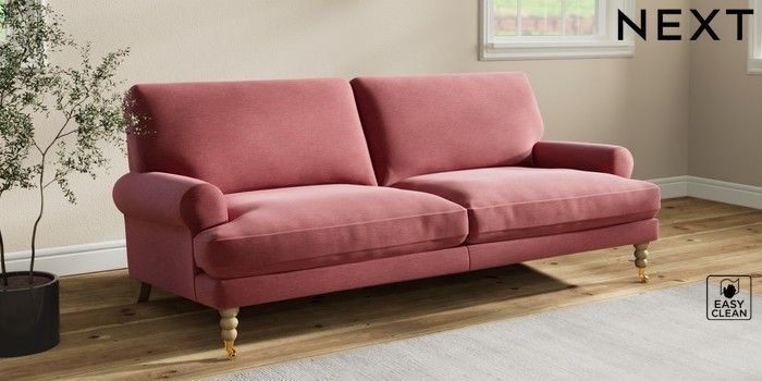 7.2.10 Erin Deep Relaxed Sit 3 Seater Sofa Fine Chenille Easy Clean Mid Pink High Classic Turned Brass Castor - Light | Made Click here to use our website with more accessibility support, for example screen readers