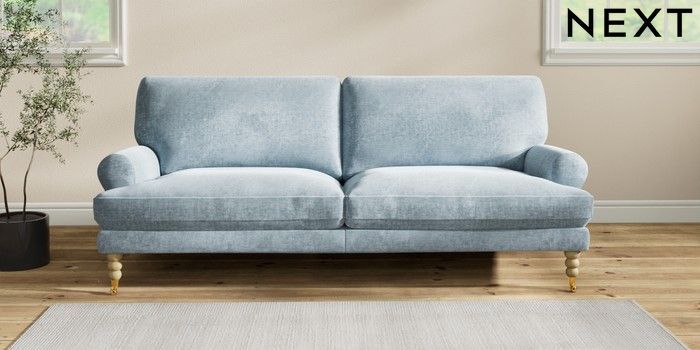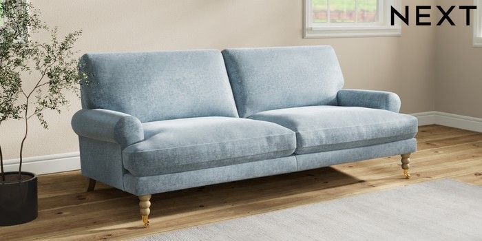 7.2.10 Erin Deep Relaxed Sit 3 Seater Sofa Plush Chenille Light Blue High Classic Turned Brass Castor - Light | Made Click here to use our website with more accessibility support, for example screen readers