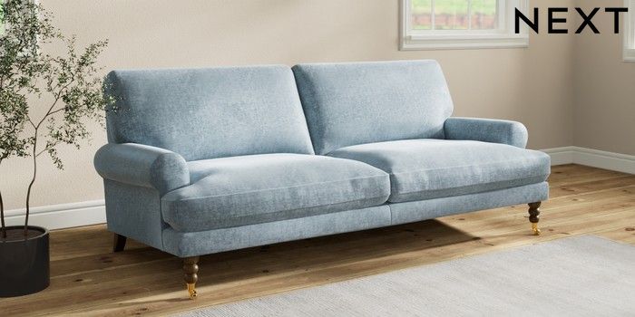 7.2.10 Erin Deep Relaxed Sit 3 Seater Sofa Plush Chenille Light Blue High Classic Turned Brass Castor - Mid | Made Click here to use our website with more accessibility support, for example screen readers