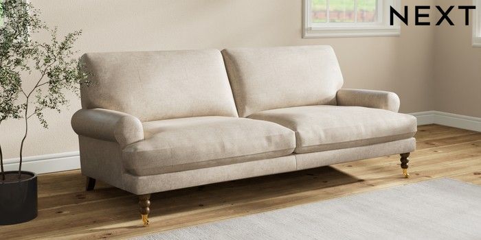 7.2.10 Erin Deep Relaxed Sit 3 Seater Sofa Plush Chenille Light Natural High Classic Turned Brass Castor - Mid | Made Click here to use our website with more accessibility support, for example screen readers