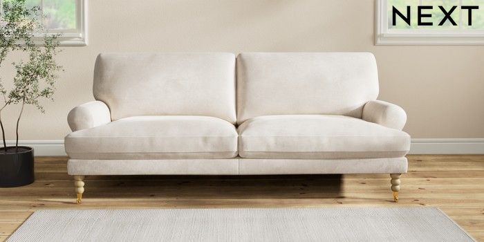 7.2.10 Erin Deep Relaxed Sit 3 Seater Sofa Plush Chenille Oyster High Classic Turned Brass Castor - Light | Made Click here to use our website with more accessibility support, for example screen readers