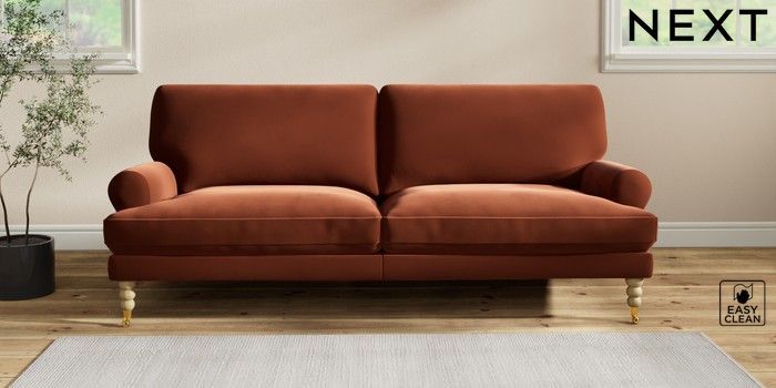 7.2.10 Erin Deep Relaxed Sit 3 Seater Sofa Plush Velvet Easy Clean Ginger Orange High Classic Turned Brass Castor - Light | Made Click here to use our website with more accessibility support, for example screen readers