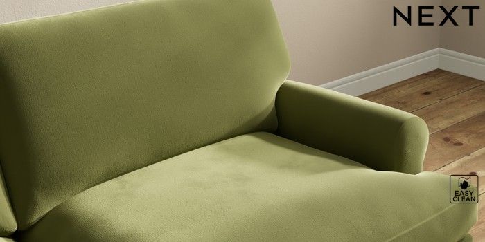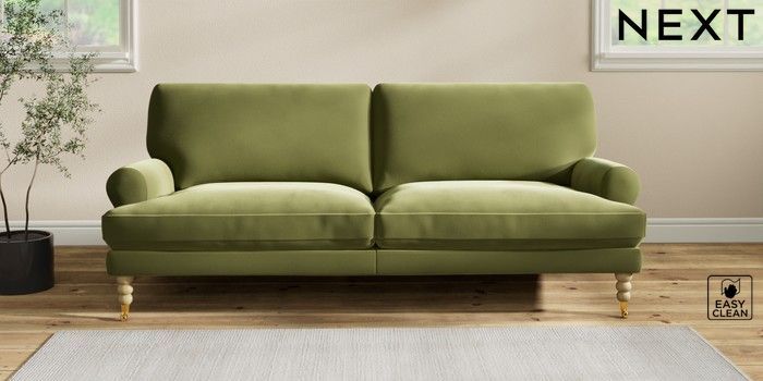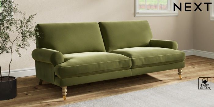 7.2.10 Erin Deep Relaxed Sit 3 Seater Sofa Plush Velvet Easy Clean Mid Olive Green High Classic Turned Brass Castor - Light | Made Click here to use our website with more accessibility support, for example screen readers