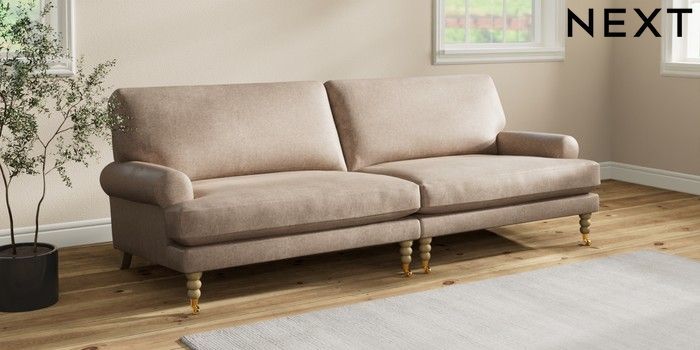 7.2.10 Erin Deep Relaxed Sit 4 Seater Large Sofa Plush Chenille Mid Natural High Classic Turned Brass Castor - Light | Made Click here to use our website with more accessibility support, for example screen readers
