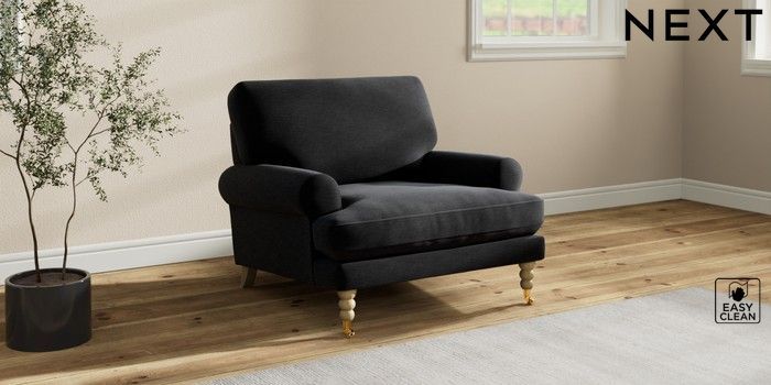 7.2.10 Erin Deep Relaxed Sit Armchair Fine Chenille Easy Clean Black High Classic Turned Brass Castor - Light | Made Click here to use our website with more accessibility support, for example screen readers