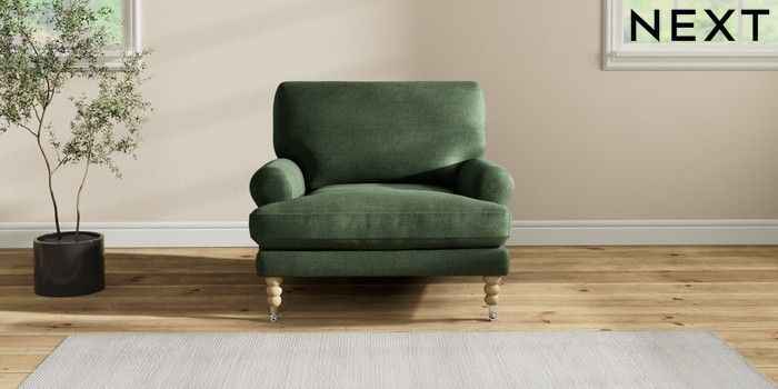 7.2.10 Erin Deep Relaxed Sit Armchair Luxe Chenille Dark Green High Classic Turned Chrome Castor - Light | Made Click here to use our website with more accessibility support, for example screen readers