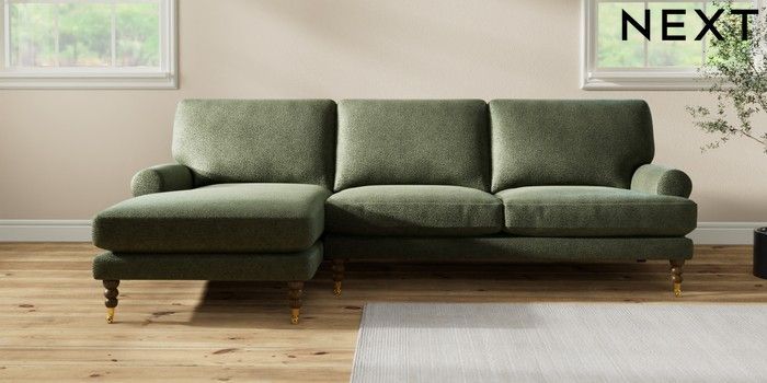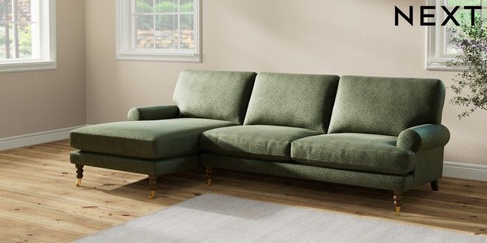 7.2.10 Erin Deep Relaxed Sit Medium Sofa Chaise - Left Hand Boucle Chenille Dark Moss Green High Classic Turned Brass Castor - Mid | Made Click here to use our website with more accessibility support, for example screen readers