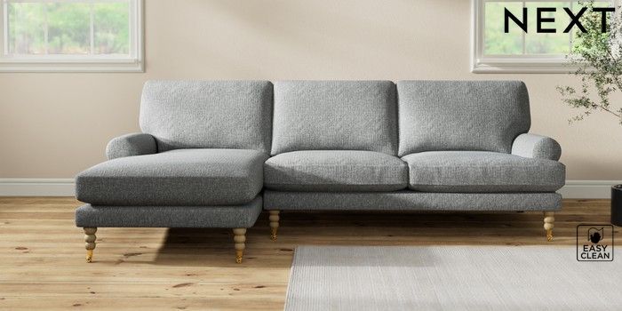 7.2.10 Erin Deep Relaxed Sit Medium Sofa Chaise - Left Hand Chunky Boucle Easy Clean Mid Grey High Classic Turned Brass Castor - Light | Made Click here to use our website with more accessibility support, for example screen readers