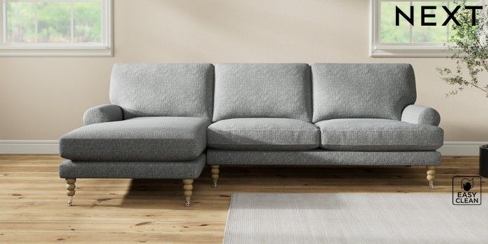 7.2.10 Erin Deep Relaxed Sit Medium Sofa Chaise - Left Hand Chunky Boucle Easy Clean Mid Grey High Classic Turned Chrome Castor - Light | Made Click here to use our website with more accessibility support, for example screen readers