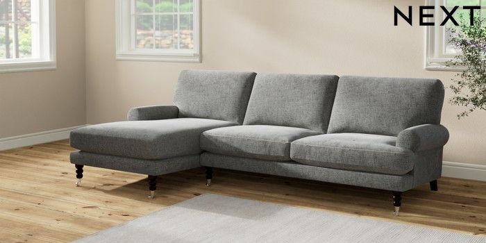 7.2.10 Erin Deep Relaxed Sit Medium Sofa Chaise - Left Hand Chunky Chenille Dark Grey High Classic Turned Chrome Castor - Dark | Made Click here to use our website with more accessibility support, for example screen readers