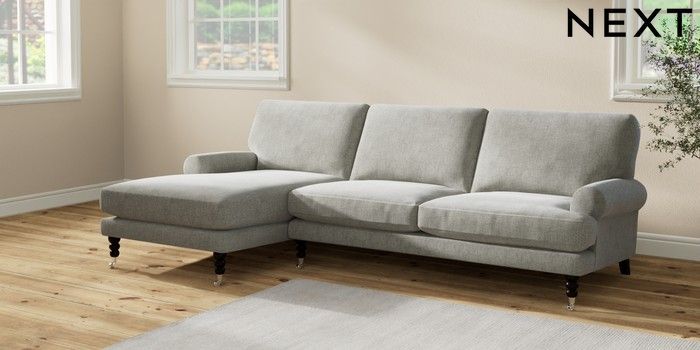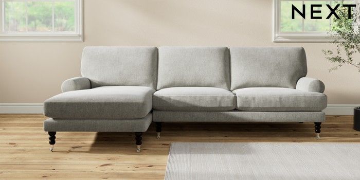 7.2.10 Erin Deep Relaxed Sit Medium Sofa Chaise - Left Hand Chunky Chenille Light Grey High Classic Turned Chrome Castor - Dark | Made Click here to use our website with more accessibility support, for example screen readers