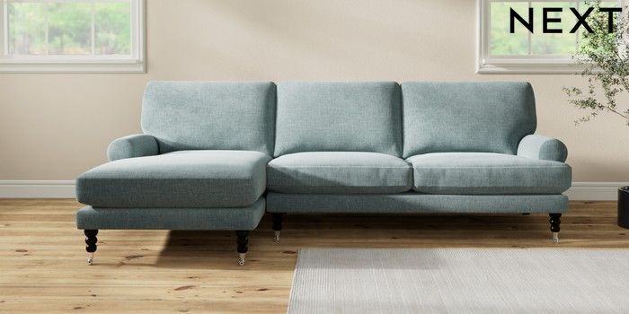 7.2.10 Erin Deep Relaxed Sit Medium Sofa Chaise - Left Hand Chunky Chenille Light Teal Green High Classic Turned Chrome Castor - Dark | Made Click here to use our website with more accessibility support, for example screen readers