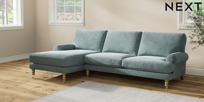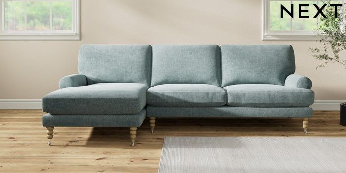 7.2.10 Erin Deep Relaxed Sit Medium Sofa Chaise - Left Hand Chunky Chenille Light Teal Green High Classic Turned Chrome Castor - Light | Made Click here to use our website with more accessibility support, for example screen readers