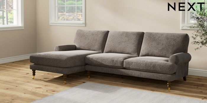 7.2.10 Erin Deep Relaxed Sit Medium Sofa Chaise - Left Hand Chunky Chenille Mink Brown High Classic Turned Brass Castor - Mid | Made Click here to use our website with more accessibility support, for example screen readers