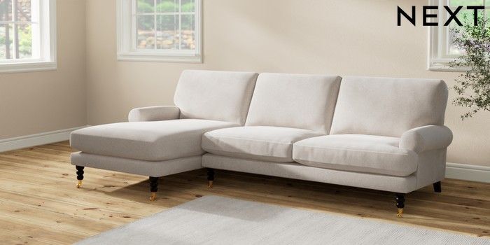 7.2.10 Erin Deep Relaxed Sit Medium Sofa Chaise - Left Hand Chunky Chenille Oyster High Classic Turned Brass Castor - Dark | Made Click here to use our website with more accessibility support, for example screen readers