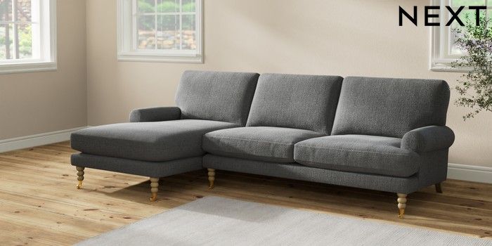 7.2.10 Erin Deep Relaxed Sit Medium Sofa Chaise - Left Hand Chunky Texture Dark Grey High Classic Turned Brass Castor - Light | Made Click here to use our website with more accessibility support, for example screen readers