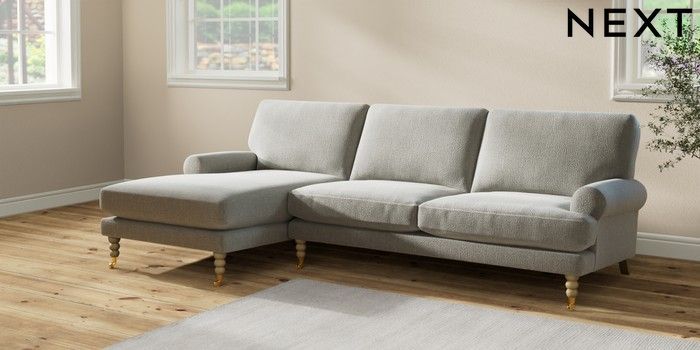 7.2.10 Erin Deep Relaxed Sit Medium Sofa Chaise - Left Hand Chunky Texture Dove High Classic Turned Brass Castor - Light | Made Click here to use our website with more accessibility support, for example screen readers