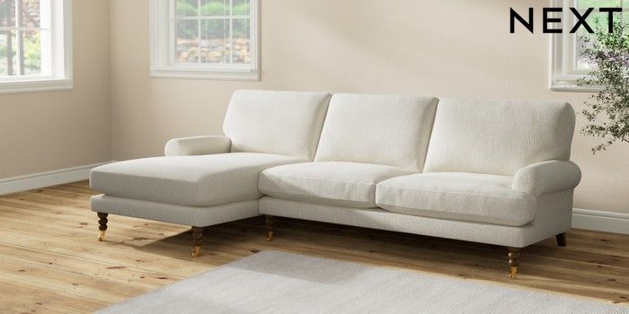7.2.10 Erin Deep Relaxed Sit Medium Sofa Chaise - Left Hand Chunky Texture Oyster High Classic Turned Brass Castor - Mid | Made Click here to use our website with more accessibility support, for example screen readers