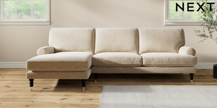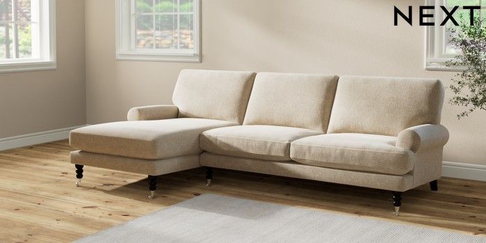 7.2.10 Erin Deep Relaxed Sit Medium Sofa Chaise - Left Hand Chunky Weave Cream High Classic Turned Chrome Castor - Dark | Made Click here to use our website with more accessibility support, for example screen readers