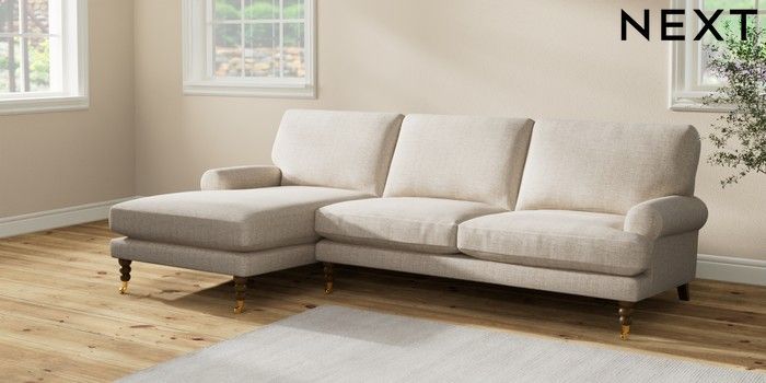 7.2.10 Erin Deep Relaxed Sit Medium Sofa Chaise - Left Hand Chunky Weave Mid Natural High Classic Turned Brass Castor - Mid | Made Click here to use our website with more accessibility support, for example screen readers