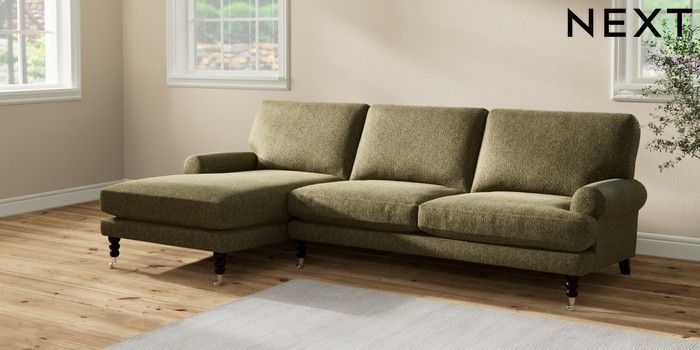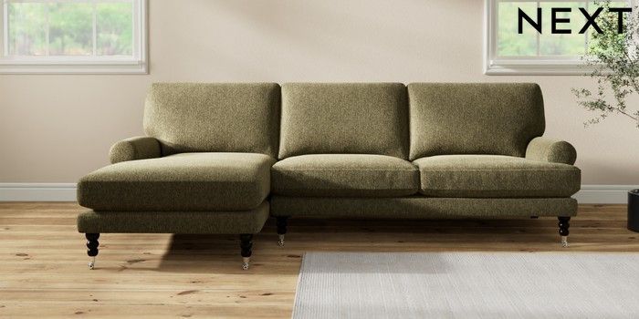 7.2.10 Erin Deep Relaxed Sit Medium Sofa Chaise - Left Hand Cotswold Chenille Dark Green High Classic Turned Chrome Castor - Dark | Made Click here to use our website with more accessibility support, for example screen readers
