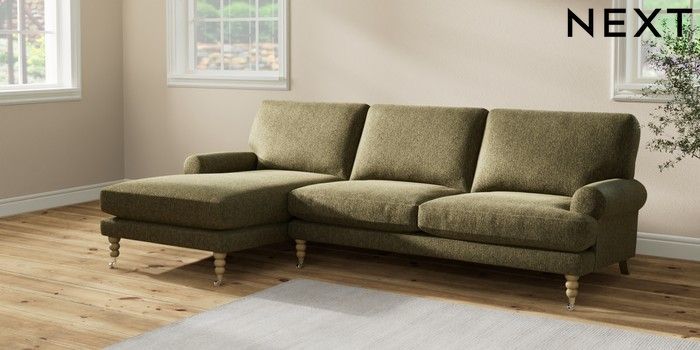7.2.10 Erin Deep Relaxed Sit Medium Sofa Chaise - Left Hand Cotswold Chenille Dark Green High Classic Turned Chrome Castor - Light | Made Click here to use our website with more accessibility support, for example screen readers