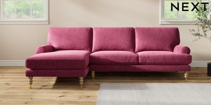 7.2.10 Erin Deep Relaxed Sit Medium Sofa Chaise - Left Hand Cotswold Chenille Dark Raspberry Pink High Classic Turned Brass Castor - Light | Made Click here to use our website with more accessibility support, for example screen readers