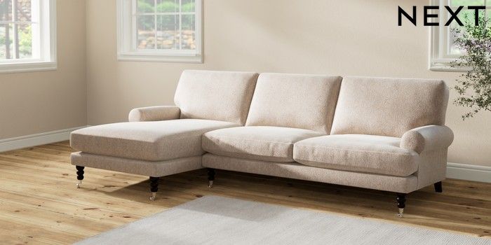 7.2.10 Erin Deep Relaxed Sit Medium Sofa Chaise - Left Hand Cotswold Chenille Light Natural High Classic Turned Chrome Castor - Dark | Made Click here to use our website with more accessibility support, for example screen readers