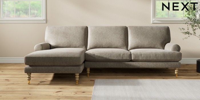 7.2.10 Erin Deep Relaxed Sit Medium Sofa Chaise - Left Hand Cotswold Chenille Mid Mink Brown High Classic Turned Brass Castor - Light | Made Click here to use our website with more accessibility support, for example screen readers