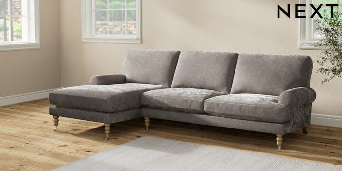 7.2.10 Erin Deep Relaxed Sit Medium Sofa Chaise - Left Hand Distressed Velour French Grey High Classic Turned Chrome Castor - Light | Made Click here to use our website with more accessibility support, for example screen readers
