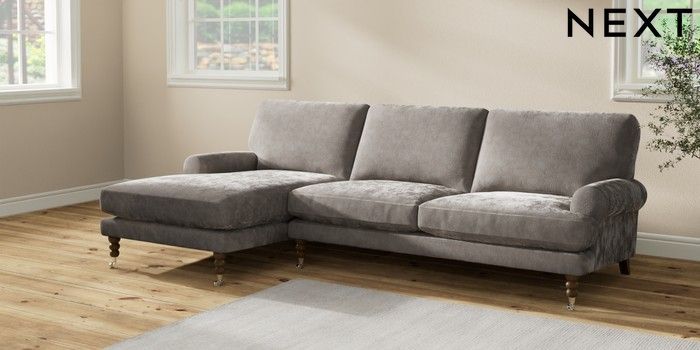 7.2.10 Erin Deep Relaxed Sit Medium Sofa Chaise - Left Hand Distressed Velour French Grey High Classic Turned Chrome Castor - Mid | Made Click here to use our website with more accessibility support, for example screen readers