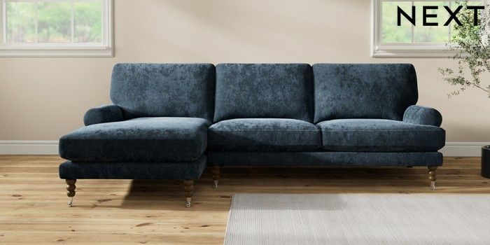 7.2.10 Erin Deep Relaxed Sit Medium Sofa Chaise - Left Hand Distressed Velour Midnight Blue High Classic Turned Chrome Castor - Mid | Made Click here to use our website with more accessibility support, for example screen readers