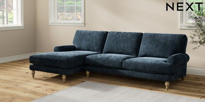 7.2.10 Erin Deep Relaxed Sit Medium Sofa Chaise - Left Hand Distressed Velour Midnight Blue High Classic Turned - Light | Made Click here to use our website with more accessibility support, for example screen readers