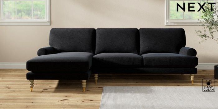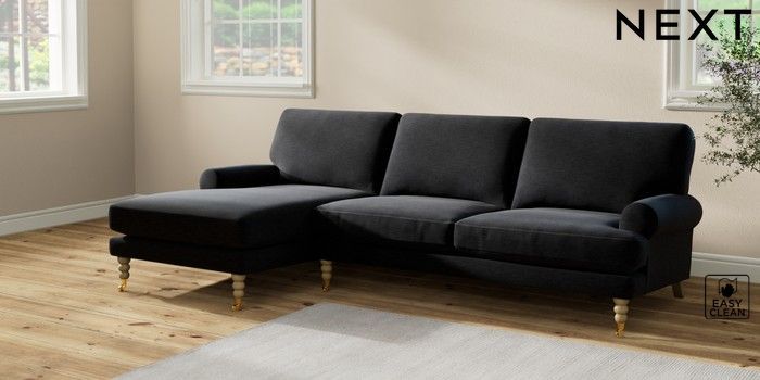7.2.10 Erin Deep Relaxed Sit Medium Sofa Chaise - Left Hand Fine Chenille Easy Clean Black High Classic Turned Brass Castor - Light | Made Click here to use our website with more accessibility support, for example screen readers