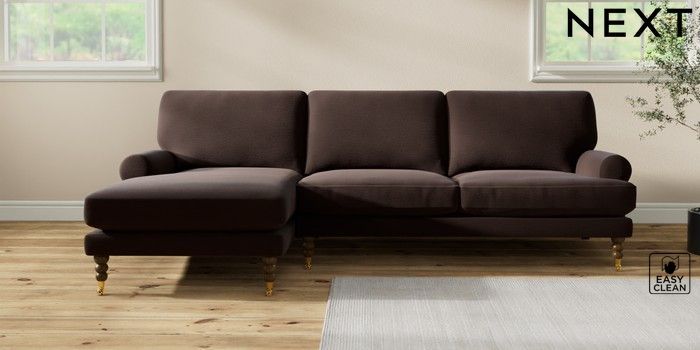 7.2.10 Erin Deep Relaxed Sit Medium Sofa Chaise - Left Hand Fine Chenille Easy Clean Chocolate Brown High Classic Turned Brass Castor - Mid | Made Click here to use our website with more accessibility support, for example screen readers