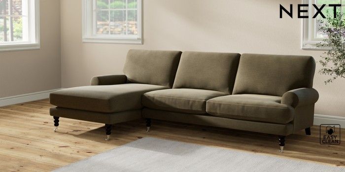7.2.10 Erin Deep Relaxed Sit Medium Sofa Chaise - Left Hand Fine Chenille Easy Clean Dark Moss Green High Classic Turned Chrome Castor - Dark | Made Click here to use our website with more accessibility support, for example screen readers