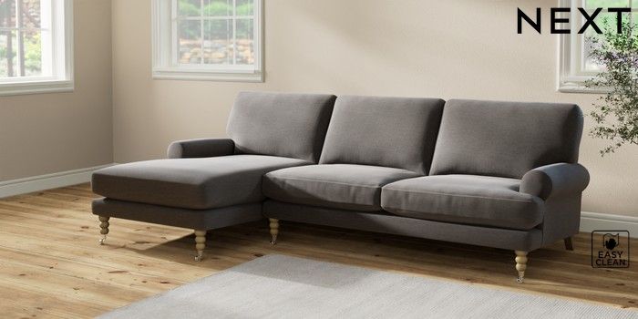 7.2.10 Erin Deep Relaxed Sit Medium Sofa Chaise - Left Hand Fine Chenille Easy Clean Dark Smoke Grey High Classic Turned Chrome Castor - Light | Made Click here to use our website with more accessibility support, for example screen readers