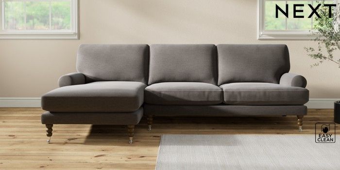 7.2.10 Erin Deep Relaxed Sit Medium Sofa Chaise - Left Hand Fine Chenille Easy Clean Dark Smoke Grey High Classic Turned Chrome Castor - Mid | Made Click here to use our website with more accessibility support, for example screen readers