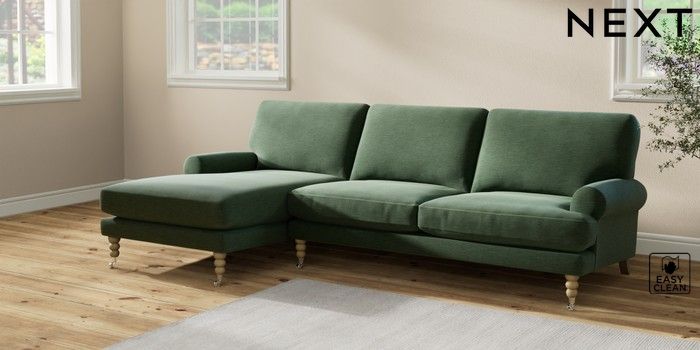 7.2.10 Erin Deep Relaxed Sit Medium Sofa Chaise - Left Hand Fine Chenille Easy Clean Mid Khaki Green High Classic Turned Chrome Castor - Light | Made Click here to use our website with more accessibility support, for example screen readers