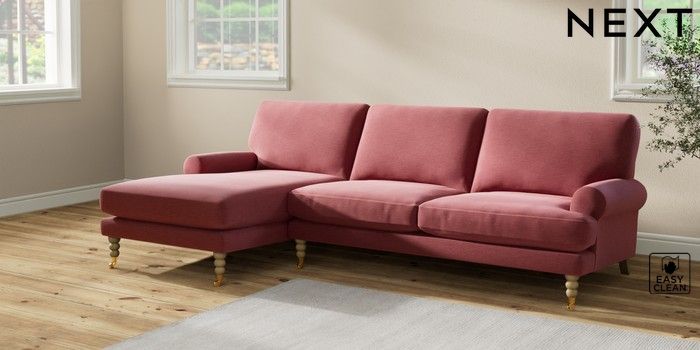 7.2.10 Erin Deep Relaxed Sit Medium Sofa Chaise - Left Hand Fine Chenille Easy Clean Mid Pink High Classic Turned Brass Castor - Light | Made Click here to use our website with more accessibility support, for example screen readers