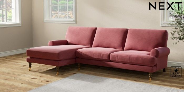 7.2.10 Erin Deep Relaxed Sit Medium Sofa Chaise - Left Hand Fine Chenille Easy Clean Mid Pink High Classic Turned Brass Castor - Mid | Made Click here to use our website with more accessibility support, for example screen readers