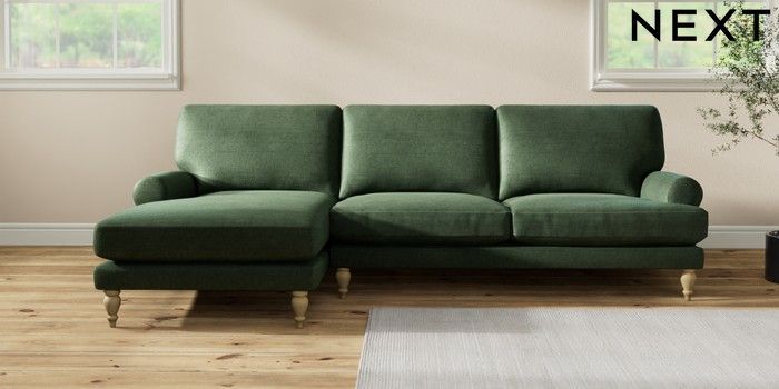 7.2.10 Erin Deep Relaxed Sit Medium Sofa Chaise - Left Hand Luxe Chenille Dark Green High Classic Turned - Light | Made Click here to use our website with more accessibility support, for example screen readers