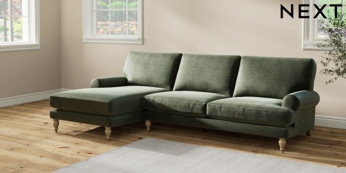 7.2.10 Erin Deep Relaxed Sit Medium Sofa Chaise - Left Hand Luxe Chenille Mid Green High Classic Turned - Light | Made Click here to use our website with more accessibility support, for example screen readers