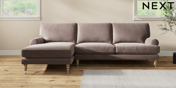 7.2.10 Erin Deep Relaxed Sit Medium Sofa Chaise - Left Hand Luxe Chenille Mink Brown High Classic Turned Chrome Castor - Light | Made Click here to use our website with more accessibility support, for example screen readers