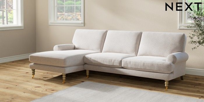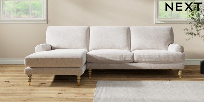 7.2.10 Erin Deep Relaxed Sit Medium Sofa Chaise - Left Hand Multi Weave Oyster High Classic Turned Brass Castor - Light | Made Click here to use our website with more accessibility support, for example screen readers