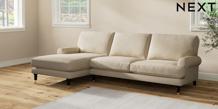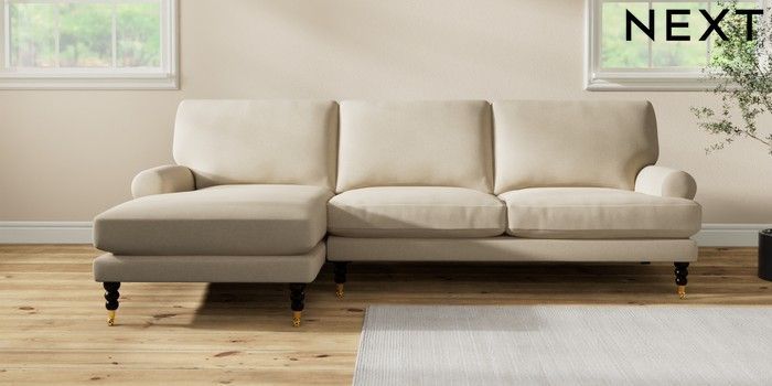 7.2.10 Erin Deep Relaxed Sit Medium Sofa Chaise - Left Hand Natural Mix Light Natural High Classic Turned Brass Castor - Dark | Made Click here to use our website with more accessibility support, for example screen readers