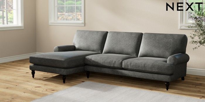 7.2.10 Erin Deep Relaxed Sit Medium Sofa Chaise - Left Hand Plush Chenille Dark Grey High Classic Turned - Dark | Made Click here to use our website with more accessibility support, for example screen readers