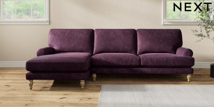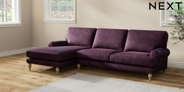 7.2.10 Erin Deep Relaxed Sit Medium Sofa Chaise - Left Hand Plush Chenille Dark Plum Purple High Classic Turned - Light | Made Click here to use our website with more accessibility support, for example screen readers