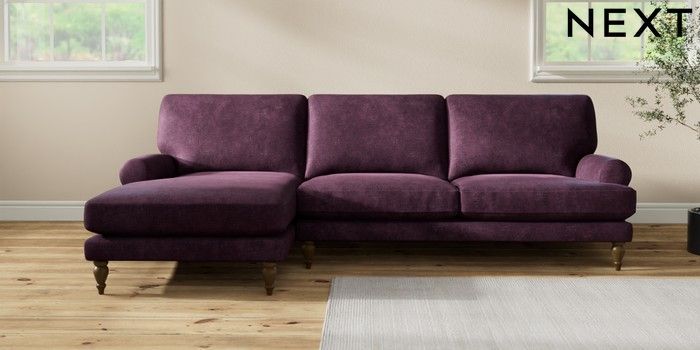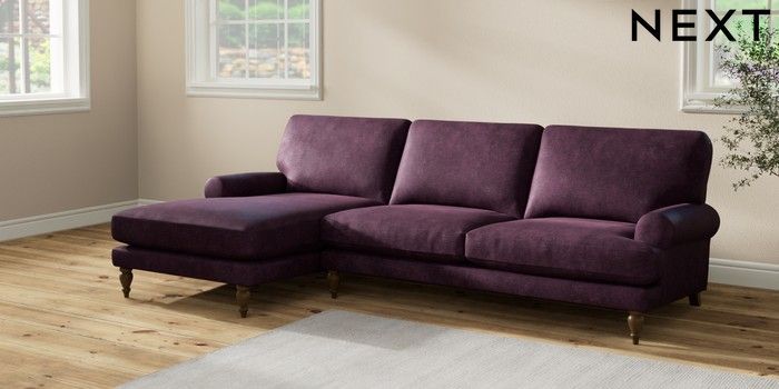 7.2.10 Erin Deep Relaxed Sit Medium Sofa Chaise - Left Hand Plush Chenille Dark Plum Purple High Classic Turned - Mid | Made Click here to use our website with more accessibility support, for example screen readers