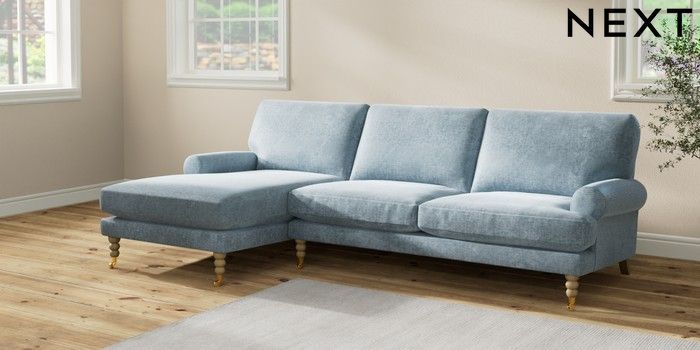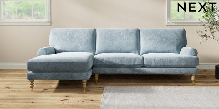 7.2.10 Erin Deep Relaxed Sit Medium Sofa Chaise - Left Hand Plush Chenille Light Blue High Classic Turned Brass Castor - Light | Made Click here to use our website with more accessibility support, for example screen readers
